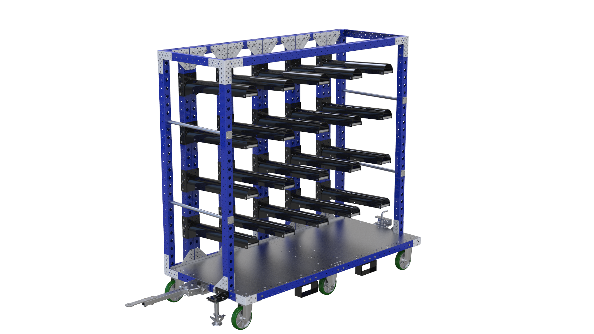 Deze kar is optimaal voor het vervoeren van onderdelen die opgehangen moeten worden, zoals slangen, buizen of draden. Elk van de hangers is verstevigd, waardoor hij ideaal is voor zwaardere materialen. Deze kar is ontworpen met een trekhaak waardoor meerdere van deze karren tegelijk kunnen verplaatst worden in een treinvorm. De vorkliftkokers laten ook transport met vorkheftruck toe. Verder is er ook een vloerrem en 6 PU wielen (2 vast en 4 zwenkwielen) die zorgen dat de karren mooi en zo goed als geluidsloos het spoor volgen als ze in treinvorm worden getrokken.