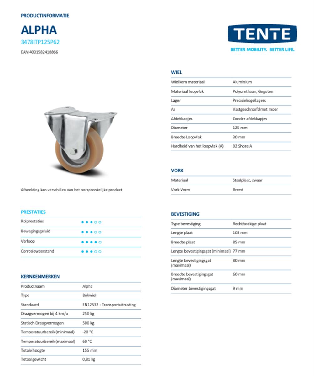 Bokwiel – TENTE 3478ITP125P62 – polyurethaan – dia 125mm – max 250 kg – 00300906