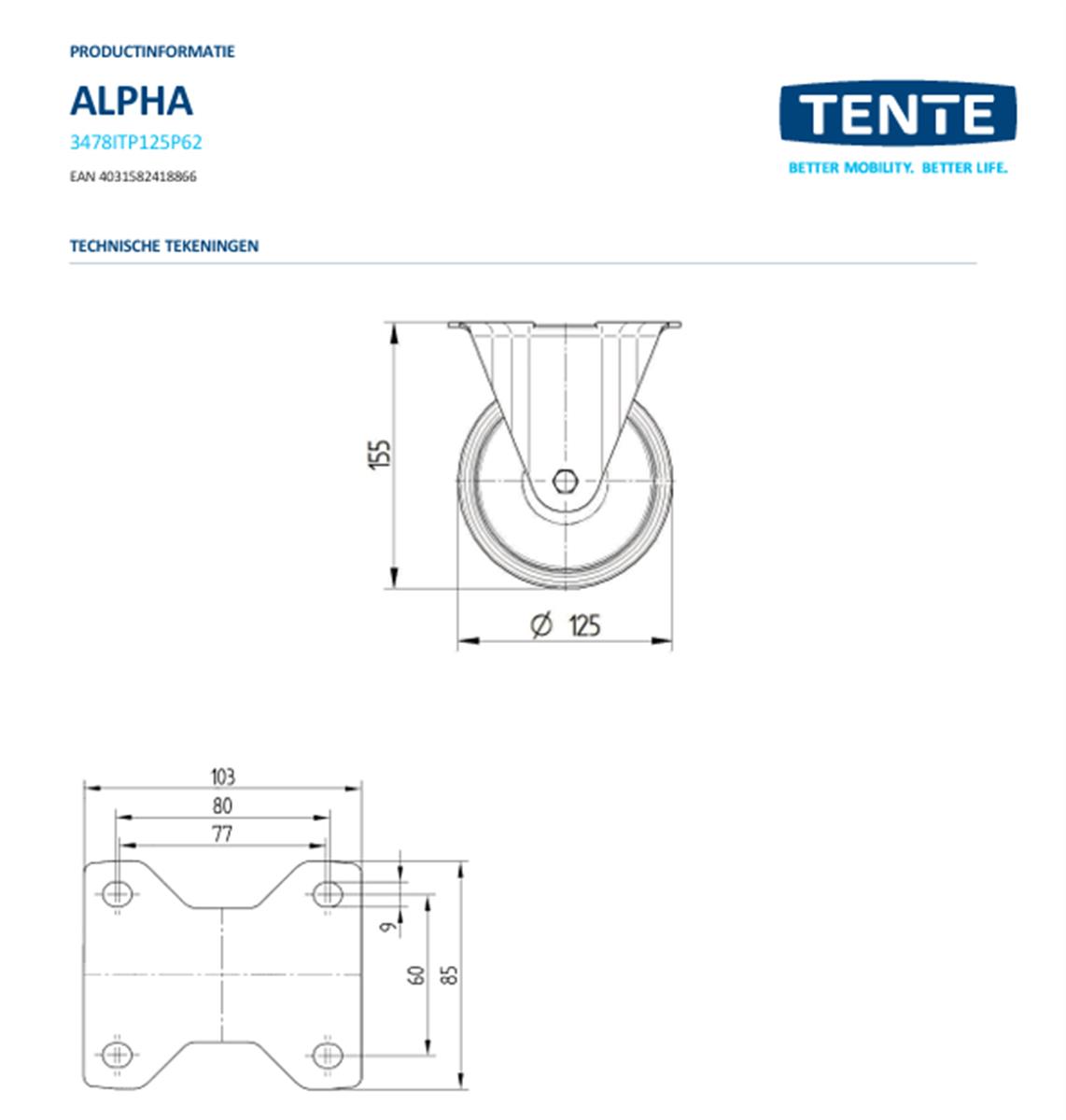 Dit wiel van Duitse topkwaliteit is ideaal om zwaar beladen karren toch nog ergonomisch te kunnen transporteren.