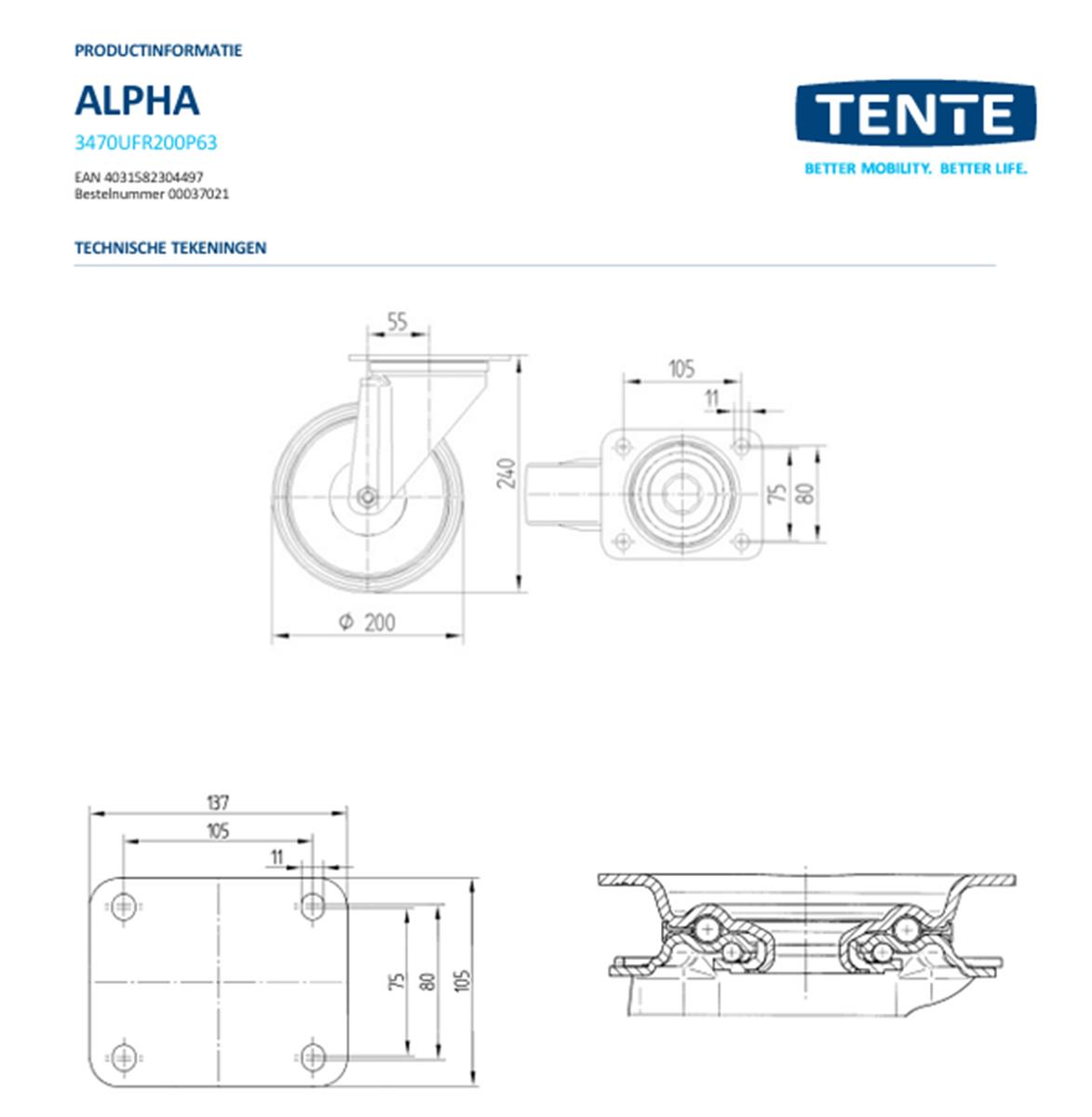 Zwenkwiel – TENTE 3470UFR200P63 – grijs rubber – dia 200mm – max 400 kg – 00037021