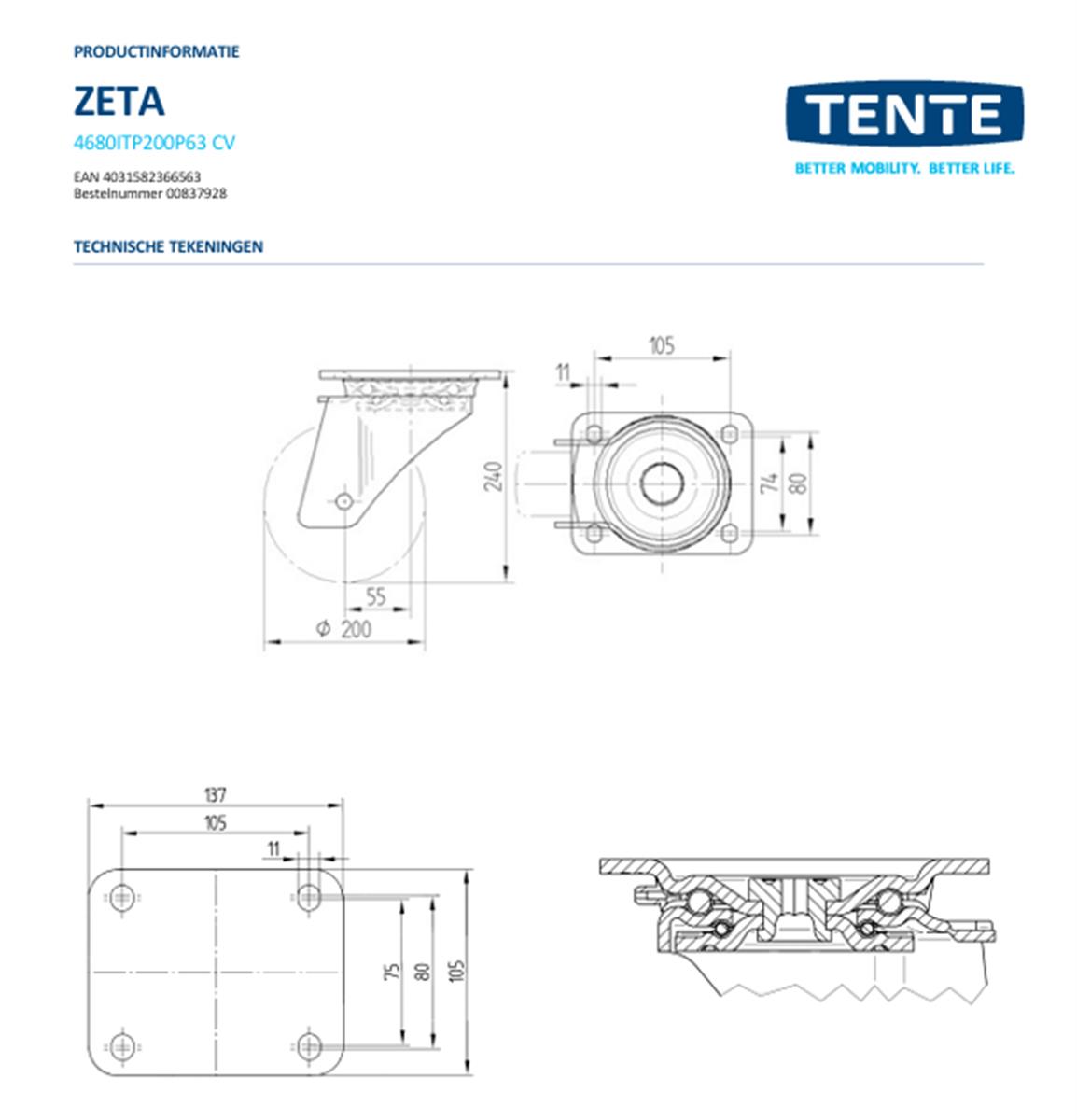 Zwaarlast zwenkwiel – TENTE 4680ITP200P63 – polyurethaan convex – dia 200mm – max 800 kg – 00837928