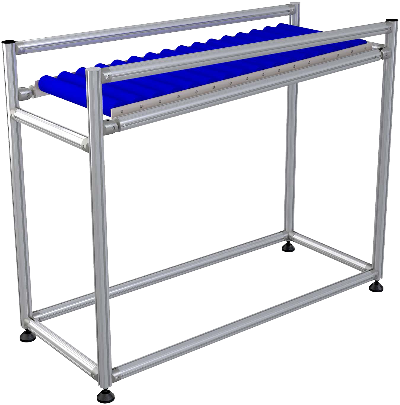 With our aluminum pipe & joint system, we design and build custom roller conveyors. The dimensions can be freely chosen, as well as the type of roller conveyor, so that we can provide the ideal solution for your products. Would you like shelves below or above the roller conveyor, or a top structure with perforated panels, lighting, etc.? Everything is possible. Even height adjustability of your roller conveyor is an option, for example, a conveyor between two height-adjustable tables.