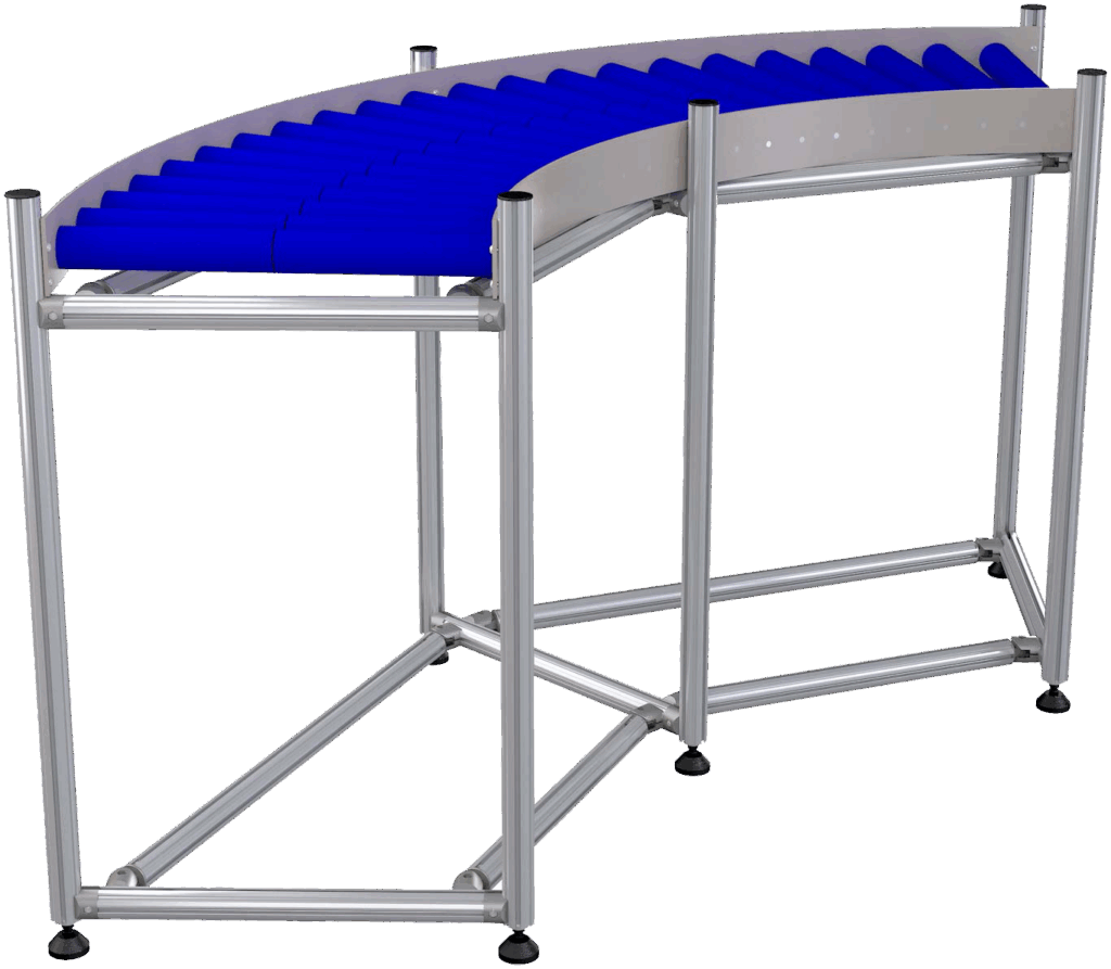A roller conveyor curve is an essential part of a roller conveyor, used to change the transport direction of goods, often in a 45° or 90° bend. The positioning and shape of the rollers are crucial to allow the goods to move smoothly through the curve. You can choose between a standard free-flow roller curve, a gravity curve, or a powered curve.