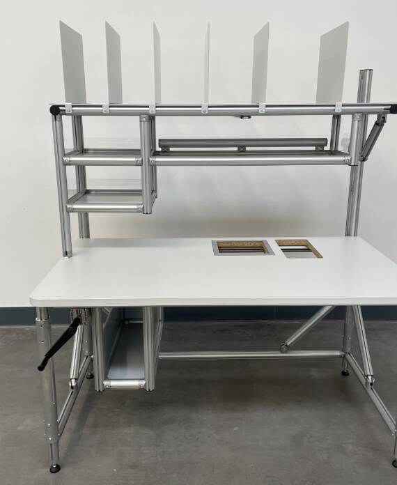 Ook hier kunnen de afmetingen vrij gekozen worden, maar daarnaast zijn er nog tal van mogelijkheden zoals een bovenbouw voor uw balancers en verlichting, ladesystemen, 5S perfo borden, toeleverschappen, monitorsteunen, tafelblad naar keuze etc. En aangezien we ergonomie hoog in het vaandel dragen, zorgen we ervoor dat de onderdelen in grijpbereik staan of kan zelf een tafelblad met buikuitsparing voorzien worden. En dit allemaal ESD-veilig !