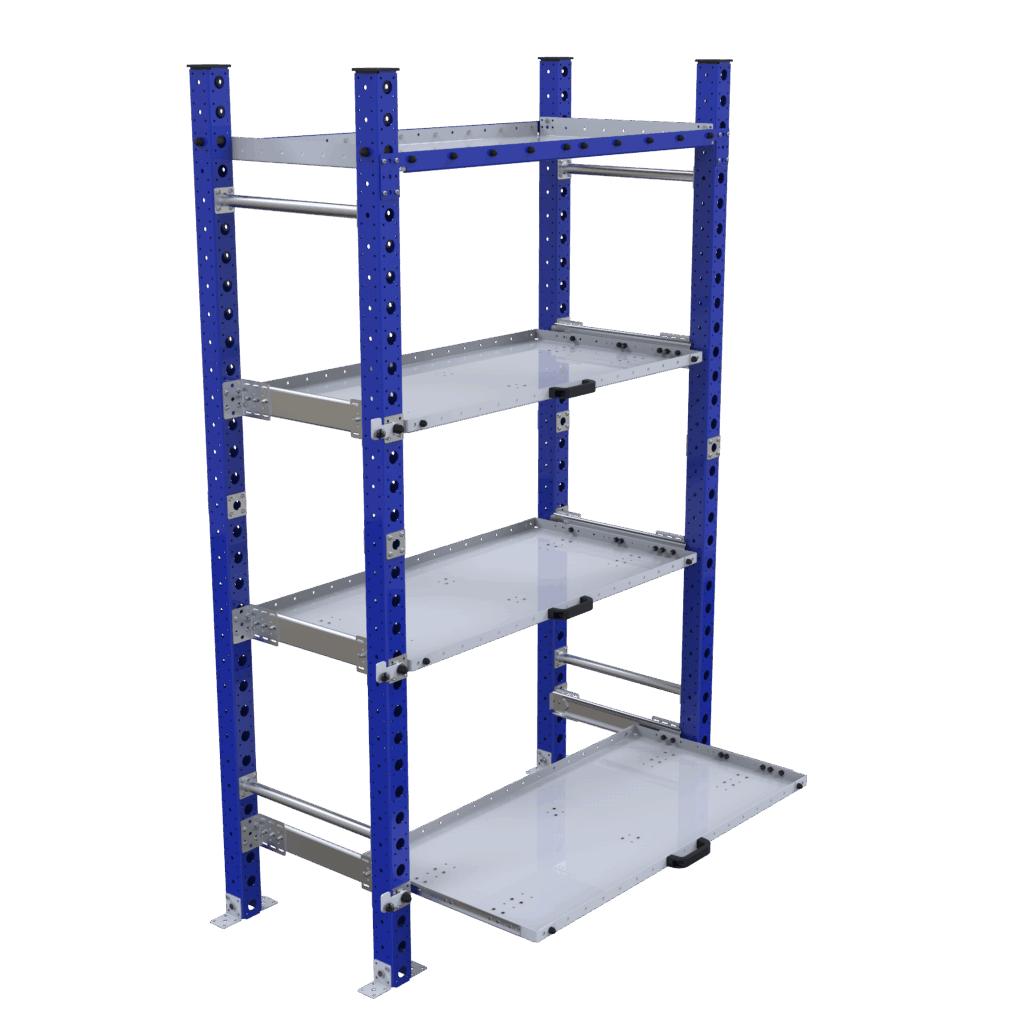 Hebt u nood aan een heel compacte opslag en de onderdelen dienen toch goed bereikbaar te zijn, dan is een stelling met uitschuifbare lades de oplossing! Deze maken het ook mogelijk om zware onderdelen met een takel te laden en te lossen.