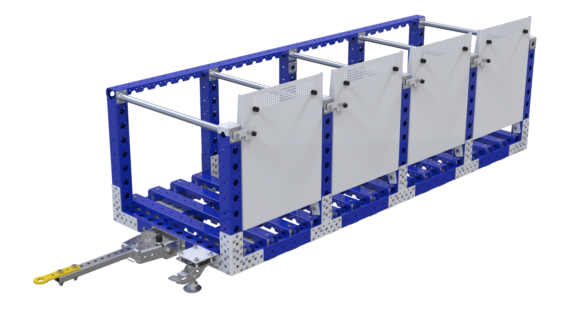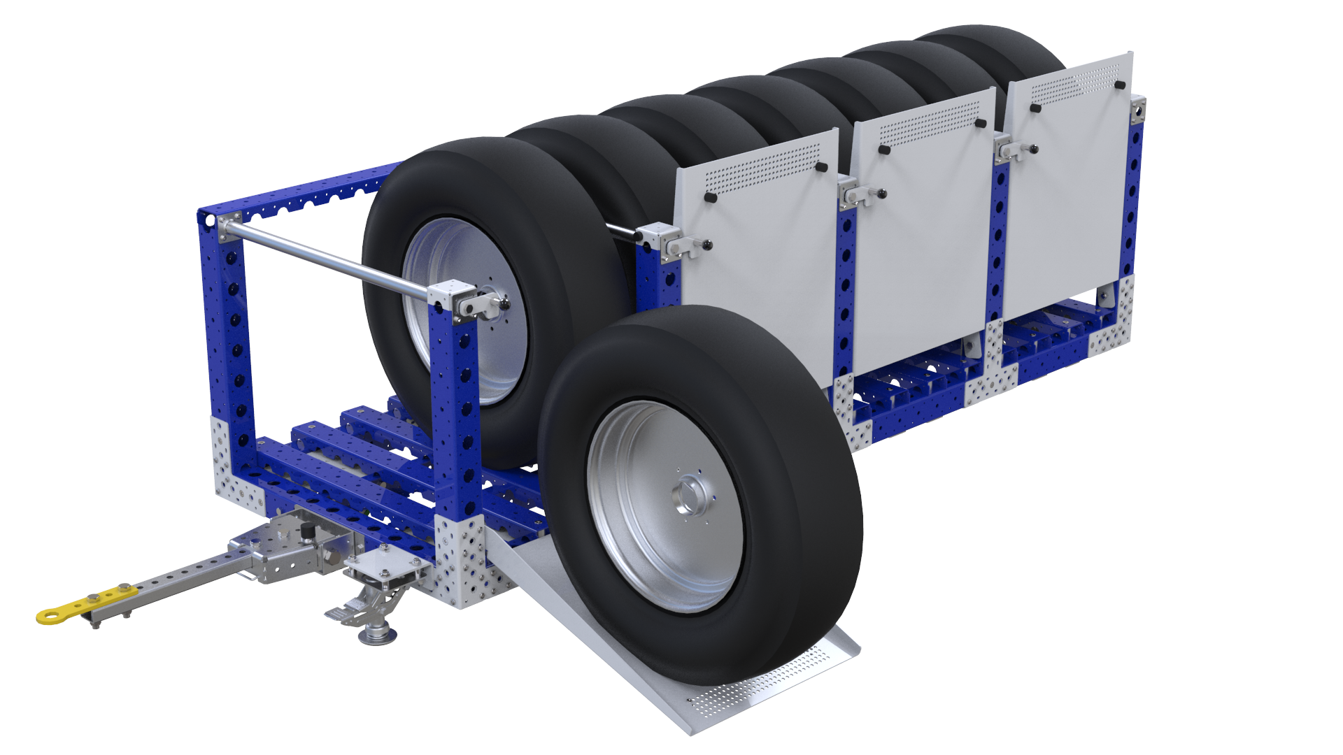 Speciaal ontworpen kitting kar voor het vervoeren van wielen/banden. De kar heeft 4 onderverdelingen voor telkens 2 wielen. Elk compartiment heeft een eigen afsluitbare oprijplaat die de band tijdens het transport veilig op zijn plaats houdt. Deze kar is ontworpen met een trekhaak waardoor meerdere van deze karren tegelijk kunnen verplaatst worden in een treinvorm. Verder is er ook een vloerrem en PU wielen die zorgen dat de karren mooi en zo goed als geluidsloos het spoor volgen als ze in treinvorm worden getrokken.