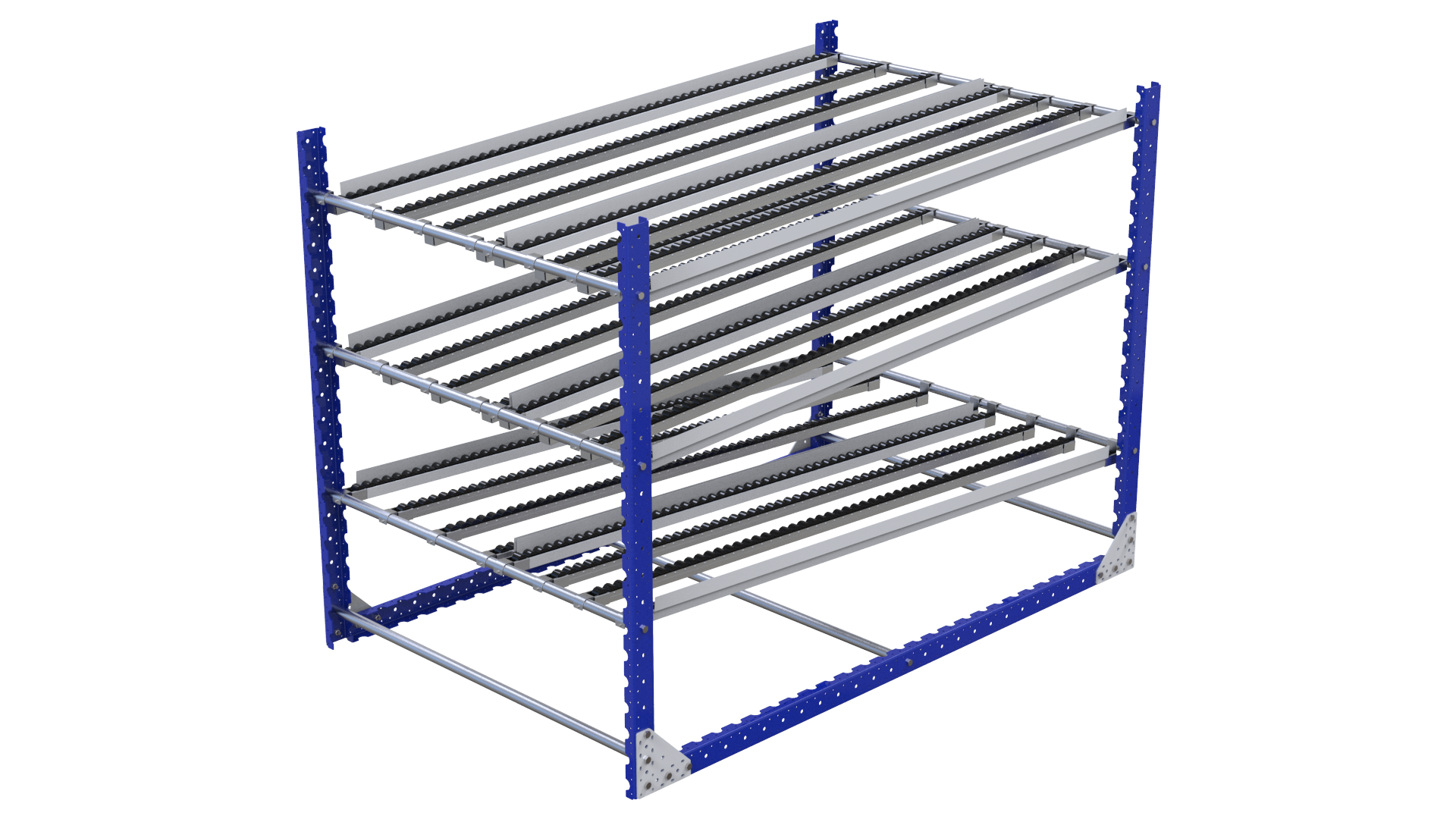 Doorrolstelling voor de presentatie van dozen en bakken met twee afleverniveaus en één retourniveau. Door het modulaire concept zijn de niveaus verstelbaar en de afstand tussen de rollenbanen individueel aanpasbaar. Het flow rek kan indien nodig ook worden voorzien van wielen.