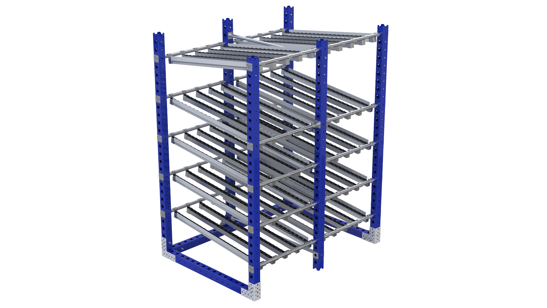 Doorrolstelling voor de presentatie van dozen en bakken met vier afleverniveaus en één retourniveau . Door het modulaire concept zijn de niveaus verstelbaar en de afstand tussen de rollenbanen individueel aanpasbaar. Een flow rek zorgt voor een compacte opslag en dus ruimtebesparing. Ideaal voor kitting van onderdelen en voor lean toepassingen waar flow, fifo en kanban belangrijk zijn. Andere configuraties (afmetingen, wielen, locaties, ...) zijn op verzoek mogelijk en ook nadien nog aan te passen. Elke locatie van de doorrolstelling kan worden voorzien van labelhouders aan voor- en/of achterzijde. Neem gerust contact op met onze specialisten Technische specificaties: - Categorie: doorrolstelling - Aantal niveau's: 5 - Draagvermogen: 750kg (150kg per niveau) - Industrie: Automotive, wapenindustrie, Defense Equipment, Distribution, Industrial Machinery, Tier One Suppliers, Wind & Energy - Afmetingen: 1610 x 1190mm - Wieldiameter: / - Wiel type: /
