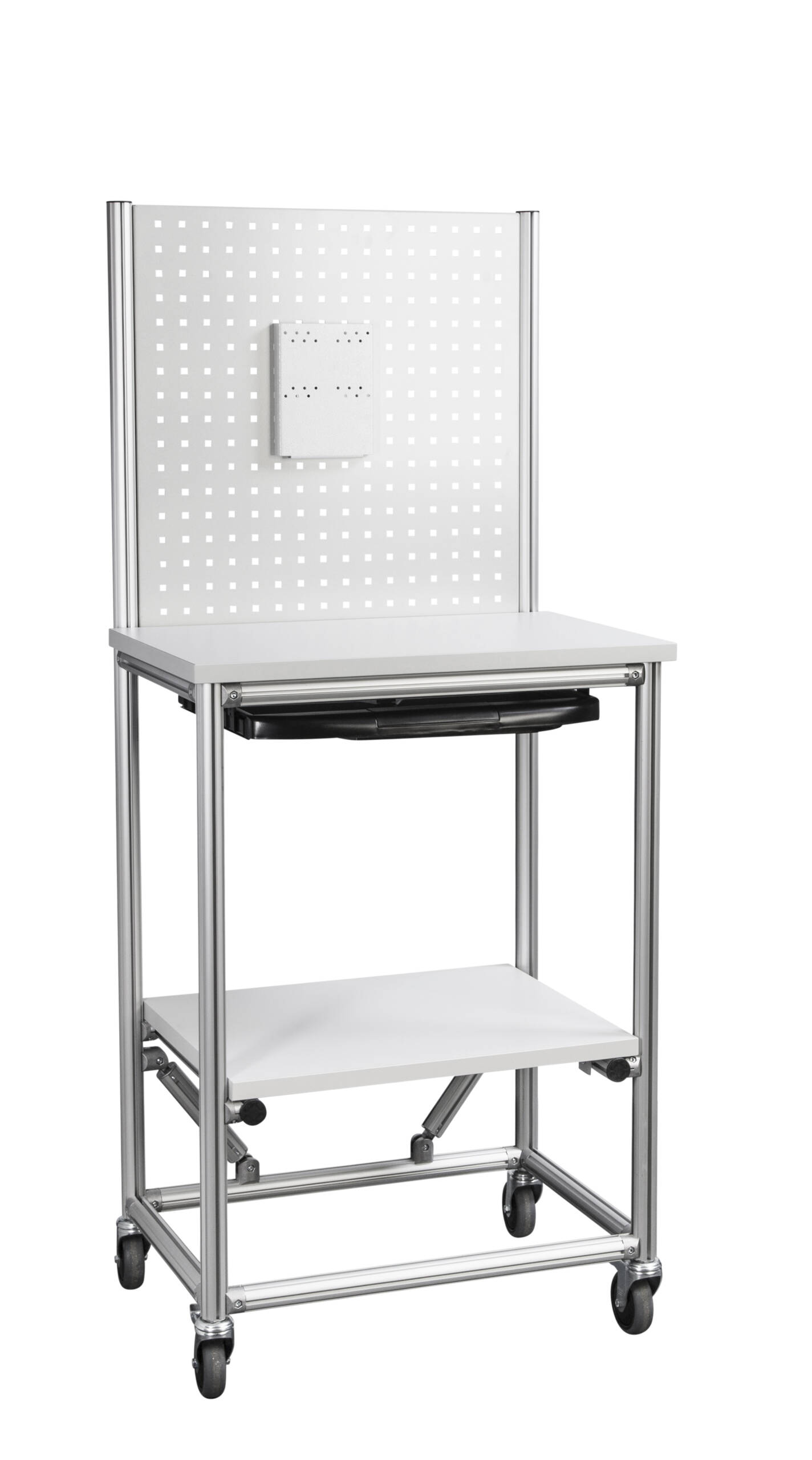 Mobiele PC werkplek in met uitschuifbare toetsenlade, perfo paneel (WxH) 645 x 666 mm, legbord voor een priner en PC. Dit ontwerp is ESD veilig waardoor het ook bruikbaar is in electronica omgevingen. Hoogwaardige kogelgelagerde zwenkwielen van polyurethaan, ø 125 mm, grijs, streeploos. Twee wielen met rem. Draagvermogen: 200 kg, Geleverd in onderdelen - eenvoudig te monteren. Dankzij het modulaire concept zijn ook andere configuraties en afmetingen mogelijk. Eventueel zelfs hoogte instelbaar. Vraag ernaar ! Technische specificaties: - Categorie: mobiele werkplek - Transport methode: manueel - Industrie: Automotive, wapenindustrie, Defense Equipment, Distribution, Industrial Machinery, Tier One Suppliers, Wind & Energy - Afmetingen: 770 x 500 x 1620 mm - Draagvermogen: 200 kg - Wieldiameter: 125 mm - Wiel type: Polyurethaan