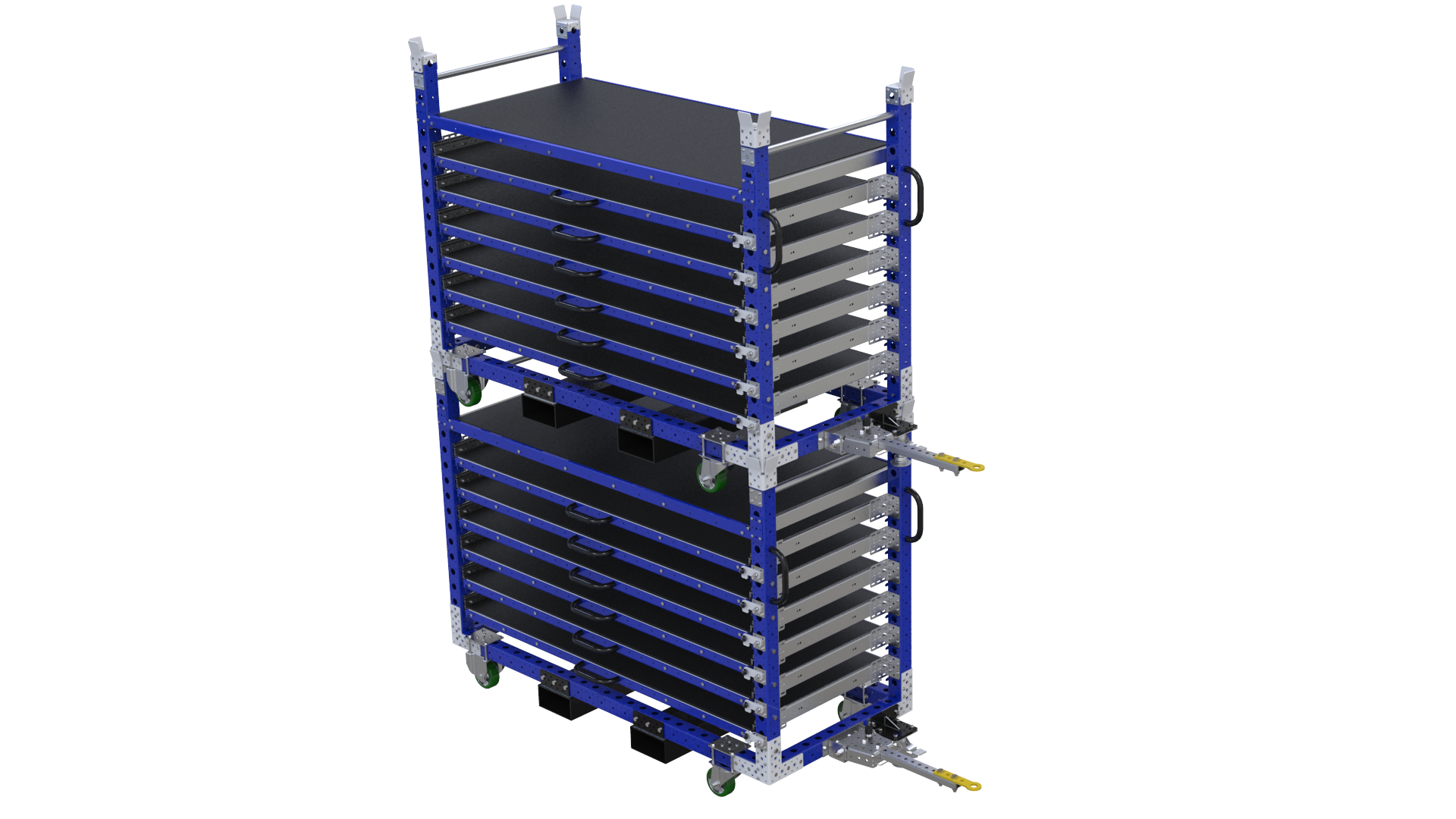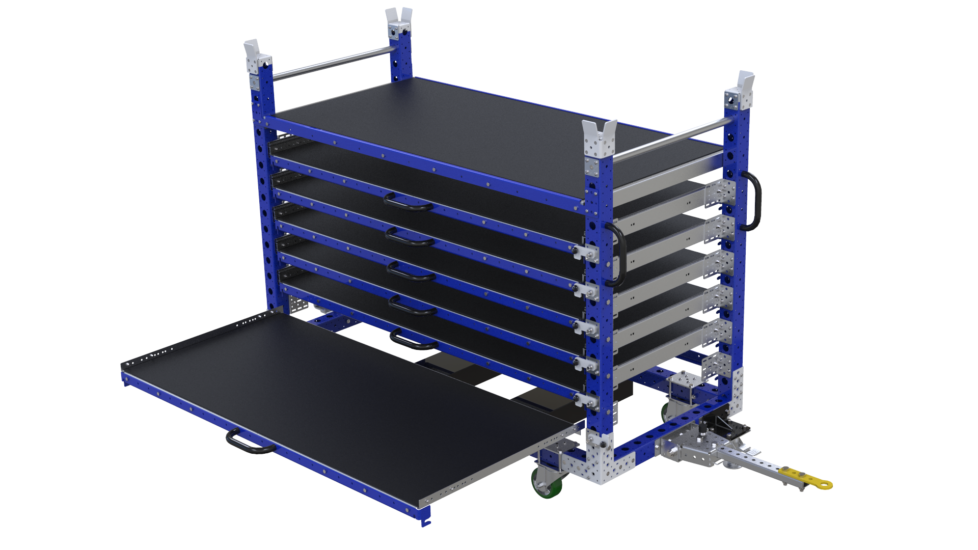 Etagewagen met 7 uitschuifbare lades ideaal voor het veilig transporteren van materiaal en losse componenten doorheen uw magazijn en productieomgeving. Het gebruik van uitschuifbare lades is ideaal voor de operatoren om de materialen gemakkelijk te kunnen bereiken en dus ergonomisch te werken. De kar is voorzien van een trekhaak, vorkliftkokers voor transport met een vorkheftruck, vloerrem en 4 PU wielen, waarvan 2 vast en 2 zwenkwielen. De karren zijn ook stapelbaar om ruimte te besparen