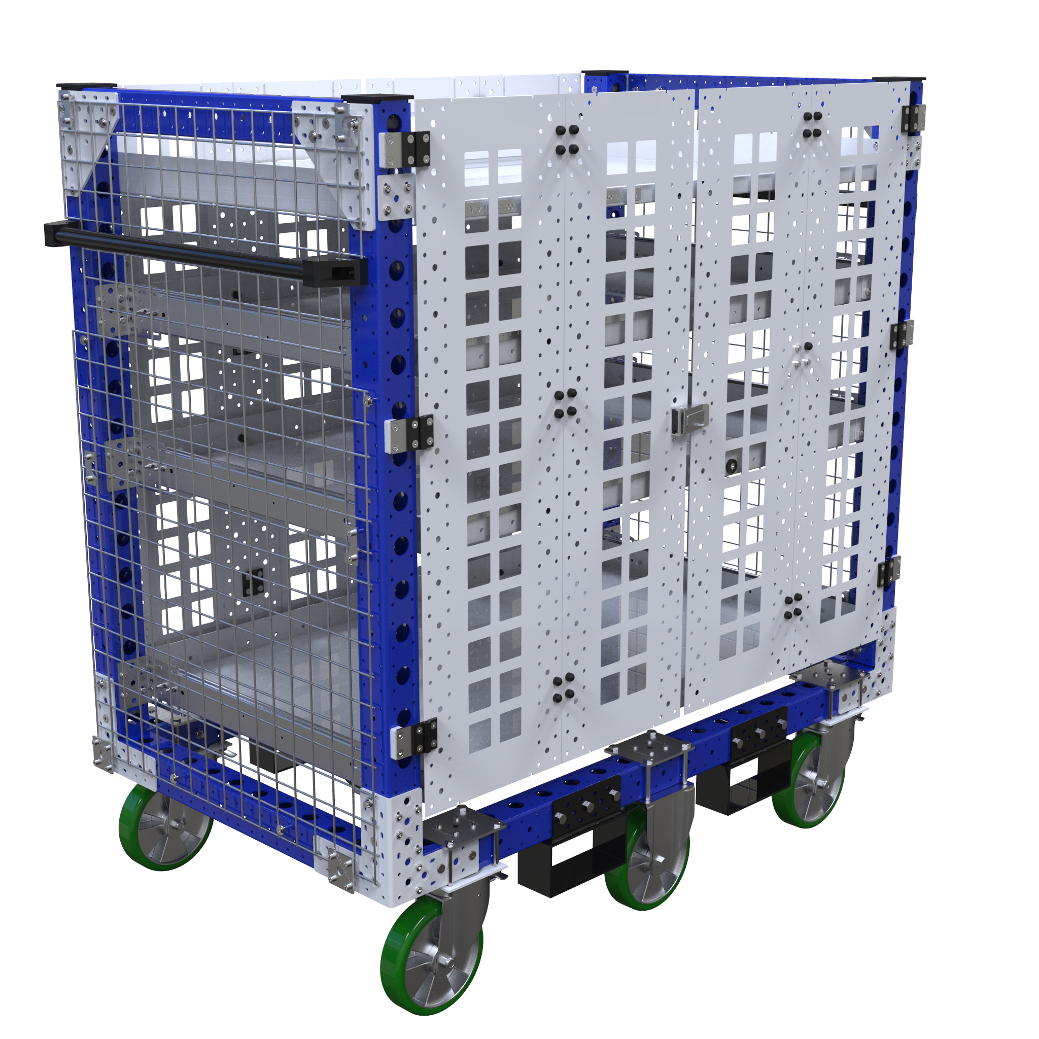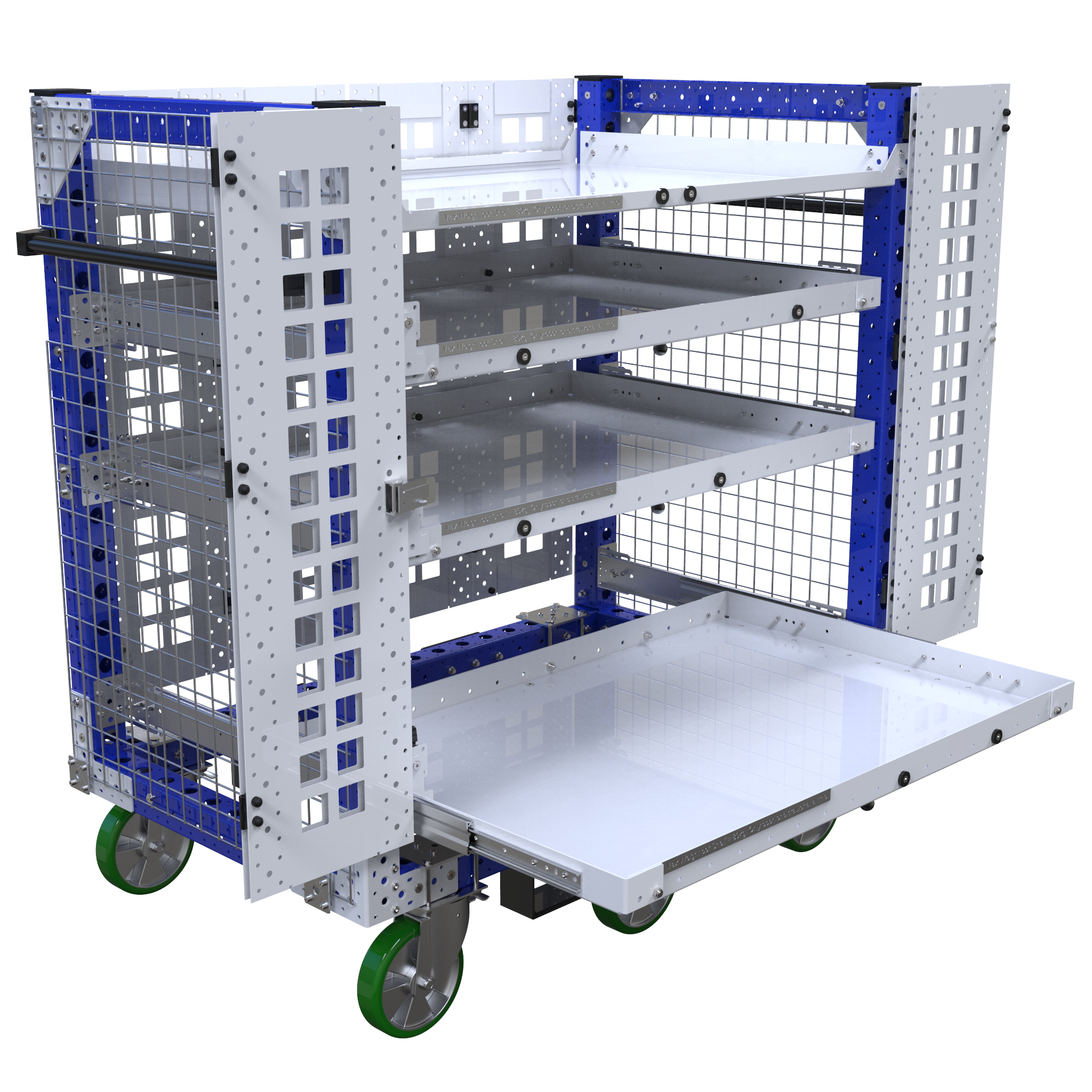 Etagewagen met 4 uitschuifbare lades ideaal voor het veilig transporteren van matieraal en losse componenten doorheen uw magazijn en productieomgeving. Het gebruik van uitschuifbare lades is ideaal voor de operatoren om de materialen gemakkelijk te kunnen bereiken en dus ergonomisch te werken. De goederen in de kar zijn volledig afgeschermd met zijpanelen en een afsluitbare deur. De kar is voorzien van een trekhaak, vorkliftkokers voor transport met een vorkheftruck en 6 PU wielen, waarvan 2 vast en 4 zwenkwielen met rem. Dankzij het modulaire concept zijn ook andere configuraties en afmetingen mogelijk. Vraag ernaar ! Technische specificaties: - Categorie: etagewagen met uitschuifbare lades - Industrie: Automotive, wapenindustrie, Defense Equipment, Distribution, Industrial Machinery, Tier One Suppliers, Wind & Energy - Transportmethode: treinvorm met trekker, vorklift of manueel - Trekhaak, handvat, vorklift kokers - Afmetingen: 1400 x 840mm - Draagvermogen: 600kg - Wieldiameter: 200mm - Wiel type: Polyurethaan