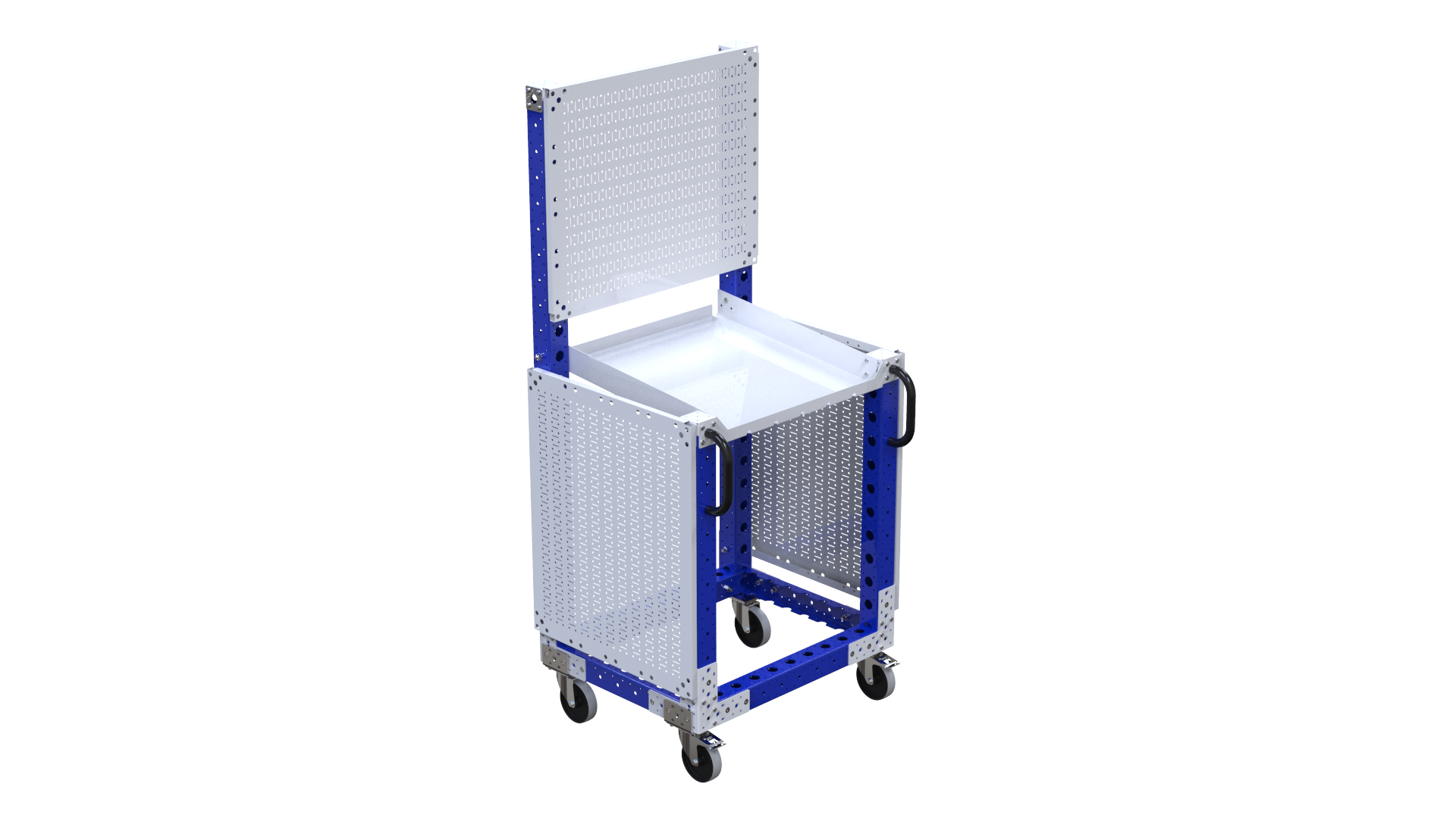 Deze gereedschapstrolley is voorzien van 3 pegborden om gereedschap op te hangen en verder ook een hellend opgestelde legbord zodat de tools gemakkelijk te nemen zijn. De kar is voorzien van 4 rubber zwenkwielen waarvan 2 met rem en verder ook handvaten zodat ze ergonomisch te verplaatsen is