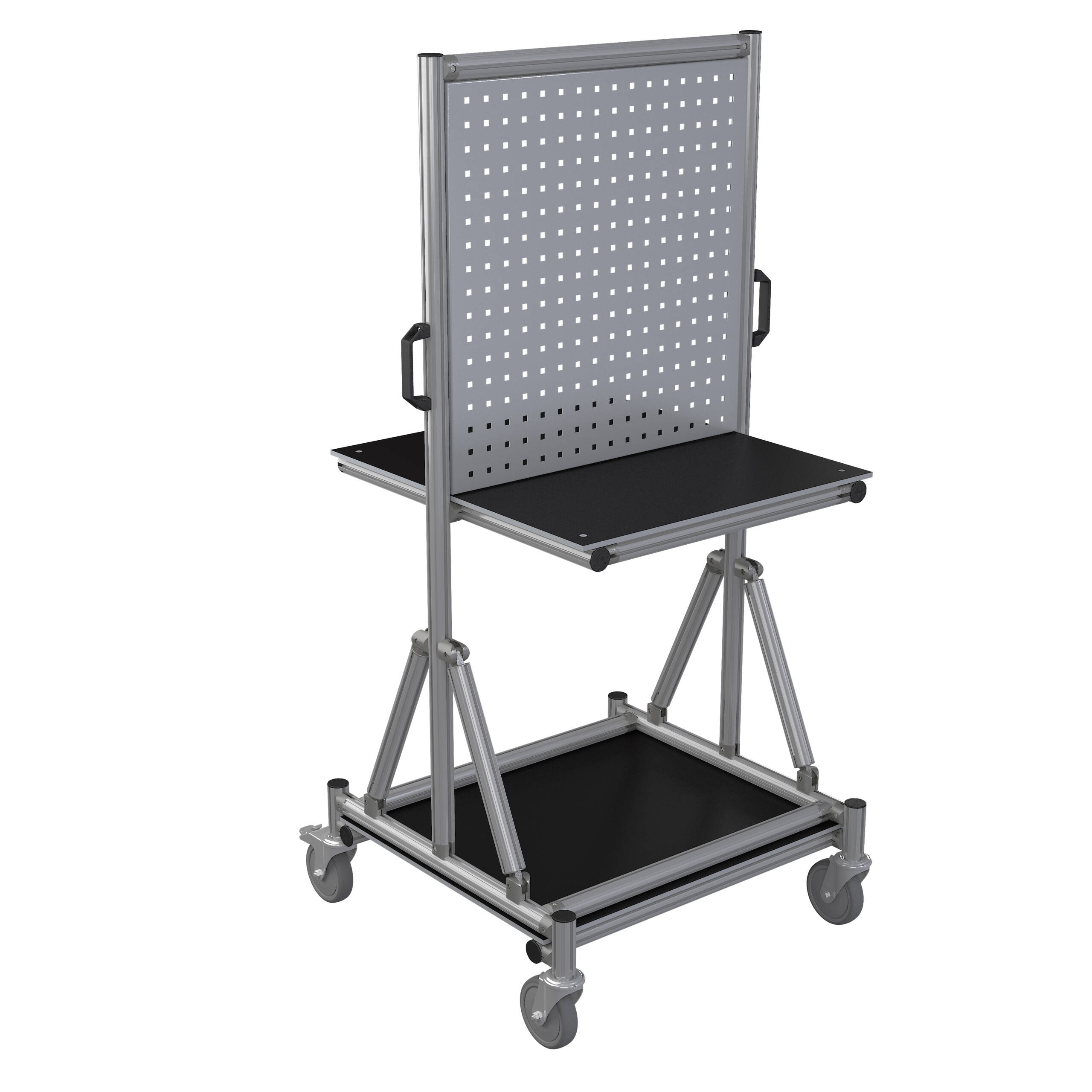Deze gereedschapstrolley heeft aan beide zijden een werkblad van 330mm diep. In het midden is een perfopaneel voorzien (666x645mm - vierkante gaten 10x10mm in een 38mm raster). Onderaan de kar is ook nog een legbord voorzien. Hoogwaardige kogelgelagerde zwenkwielen van polyurethaan, ø 125 mm, grijs, streeploos. Twee wielen met rem. Draagvermogen: 300 kg, Geleverd in onderdelen - eenvoudig te monteren. Dankzij het modulaire concept zijn ook andere configuraties en afmetingen mogelijk. Vraag ernaar ! Technische specificaties: - Categorie: mobiele werkplek - Industrie: Automotive, wapenindustrie, Defense Equipment, Distribution, Industrial Machinery, Tier One Suppliers, Wind & Energy - Transportmethode: manueel - Afmetingen: 724 x 700 x 1600 mm - Draagvermogen: 300 kg - Wieldiameter: 125 mm - Wiel type: Rubber