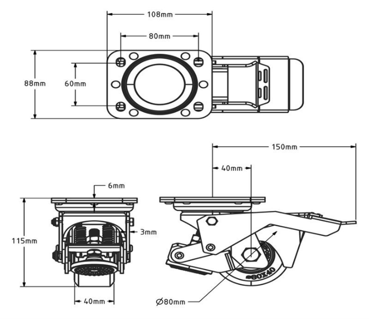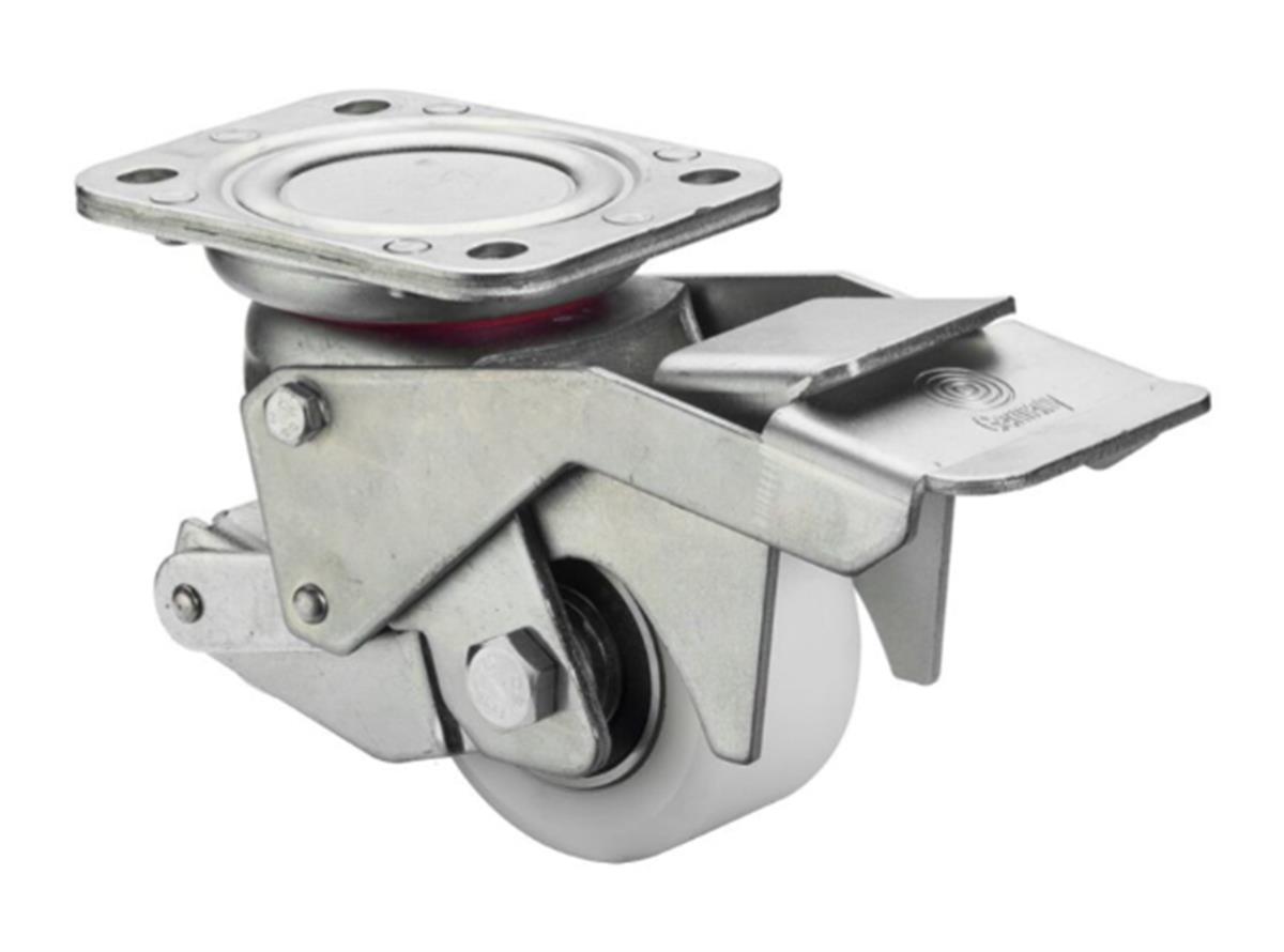 – Type wiel: Zwenkwiel met ingebouwde vastzetvoet