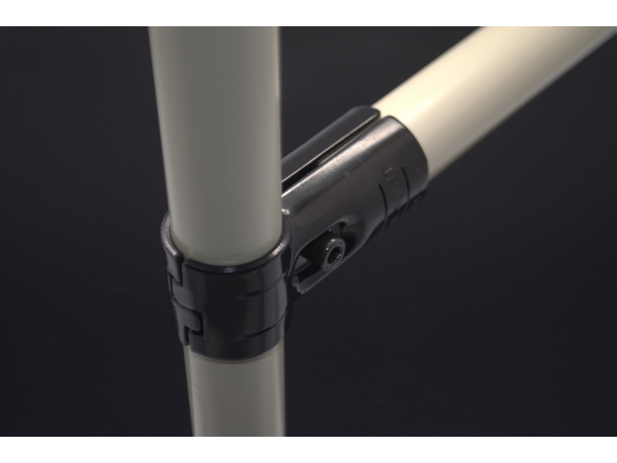 De HJ-1 stalen koppeling is zwart gelakt of voorzien van een nikkel coating. Met deze HJ-1 koppeling verbind je twee buizen onder een hoek van 90°. Deze verbinding maak je heel vlot met bout en moer. Het specifiek ontworpen grip patroon in de koppeling zorgt voor een heel sterke klemkracht.