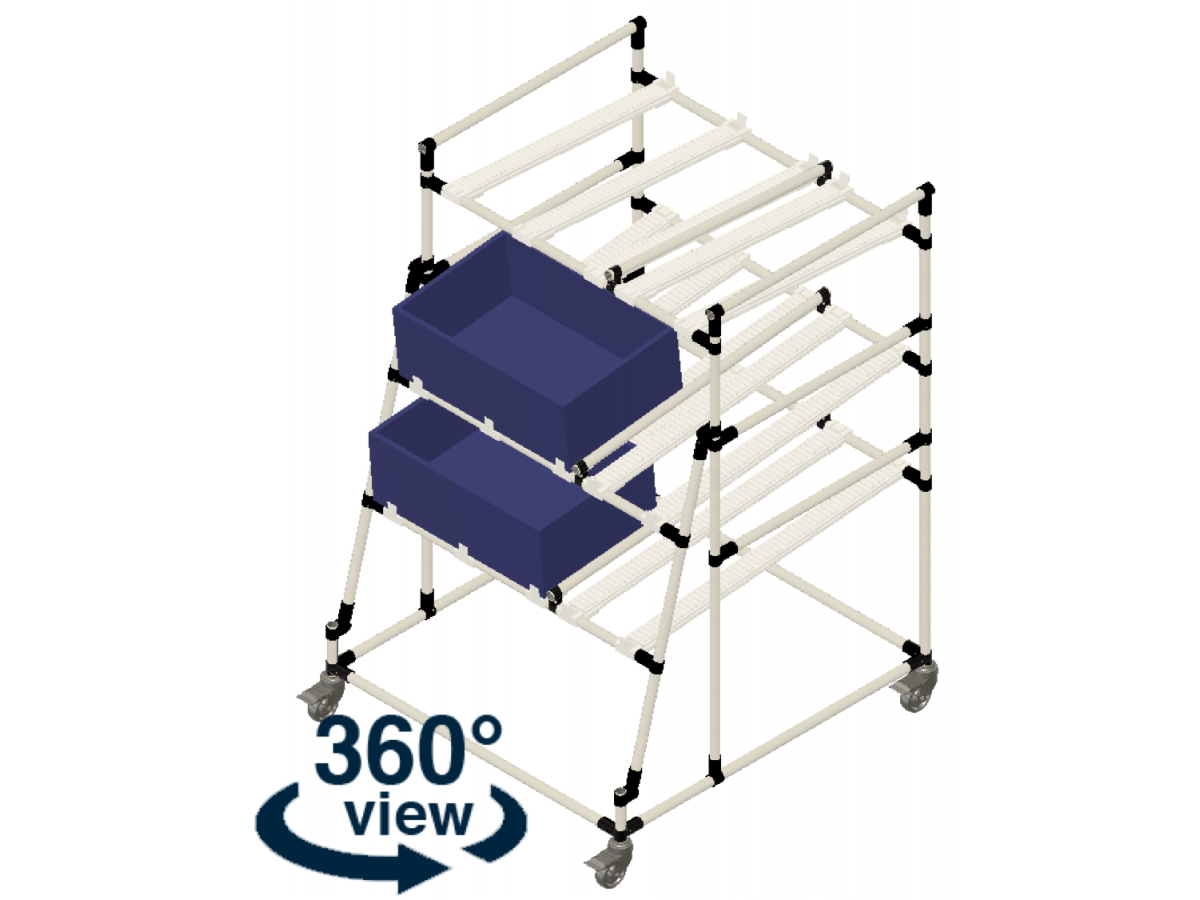 Mobiele kabanstelling met twee afleverniveaus en een retour voor het efficient sorteren of verzamelen van onderdelen uit dozen en bakken. De bakken blijven mooi in positie door de geleidingsbuizen. Door het modulaire concept zijn de niveaus verstelbaar en de afstand tussen de rollenbanen individueel aanpasbaar. Een flow rek zorgt voor een compacte opslag en dus ruimtebesparing. Ideaal voor kitting van onderdelen en voor lean toepassingen waar flow, fifo en kanban belangrijk zijn. Andere configuraties (afmetingen, locaties, ...) zijn op verzoek mogelijk en ook nadien nog aan te passen. Elke locatie van de doorrolstelling kan worden voorzien van labelhouders aan voor- en/of achterzijde. Neem gerust contact op met onze specialisten Technische specificaties: - Categorie: doorrolstelling - Aantal niveau's: 2 + retour - Industrie: Automotive, wapenindustrie, Defense Equipment, Distribution, Industrial Machinery, Tier One Suppliers, Wind & Energy - Afmetingen: 1020 x 1085 x 1580 mm - Draagvermogen: 450kg (150kg per niveau)