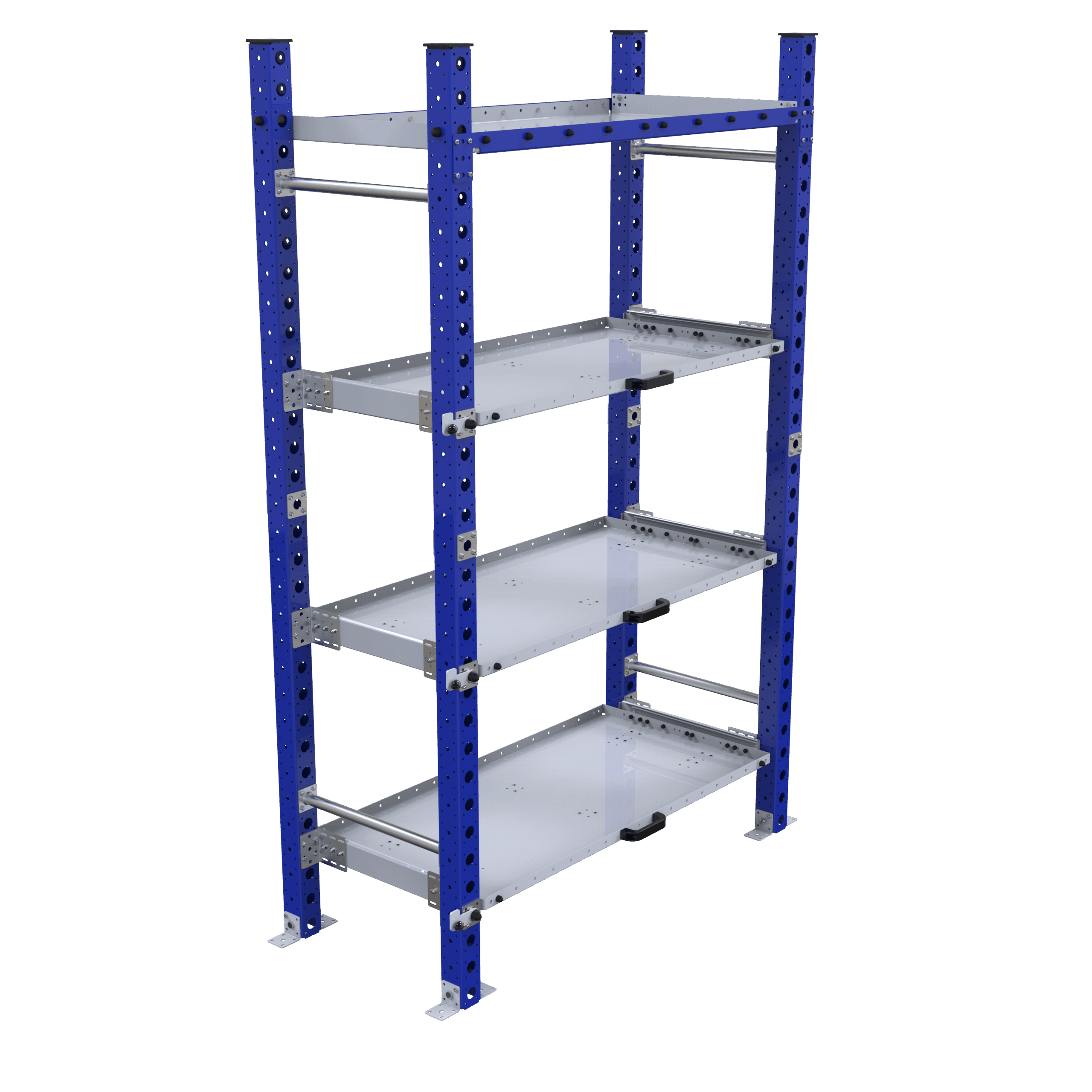 Legbordstelling met 4 legborden waarvan 3 uitschuifbaar, ideaal voor het veilig opslaan van losse componenten, dozen, boxen etc in uw magazijn en/of productieomgeving. Het gebruik van uitschuifbare lades is ideaal voor de operatoren om de materialen gemakkelijk te kunnen bereiken en dus ergonomisch te werken. Het rek kan in de vloer verankerd worden.