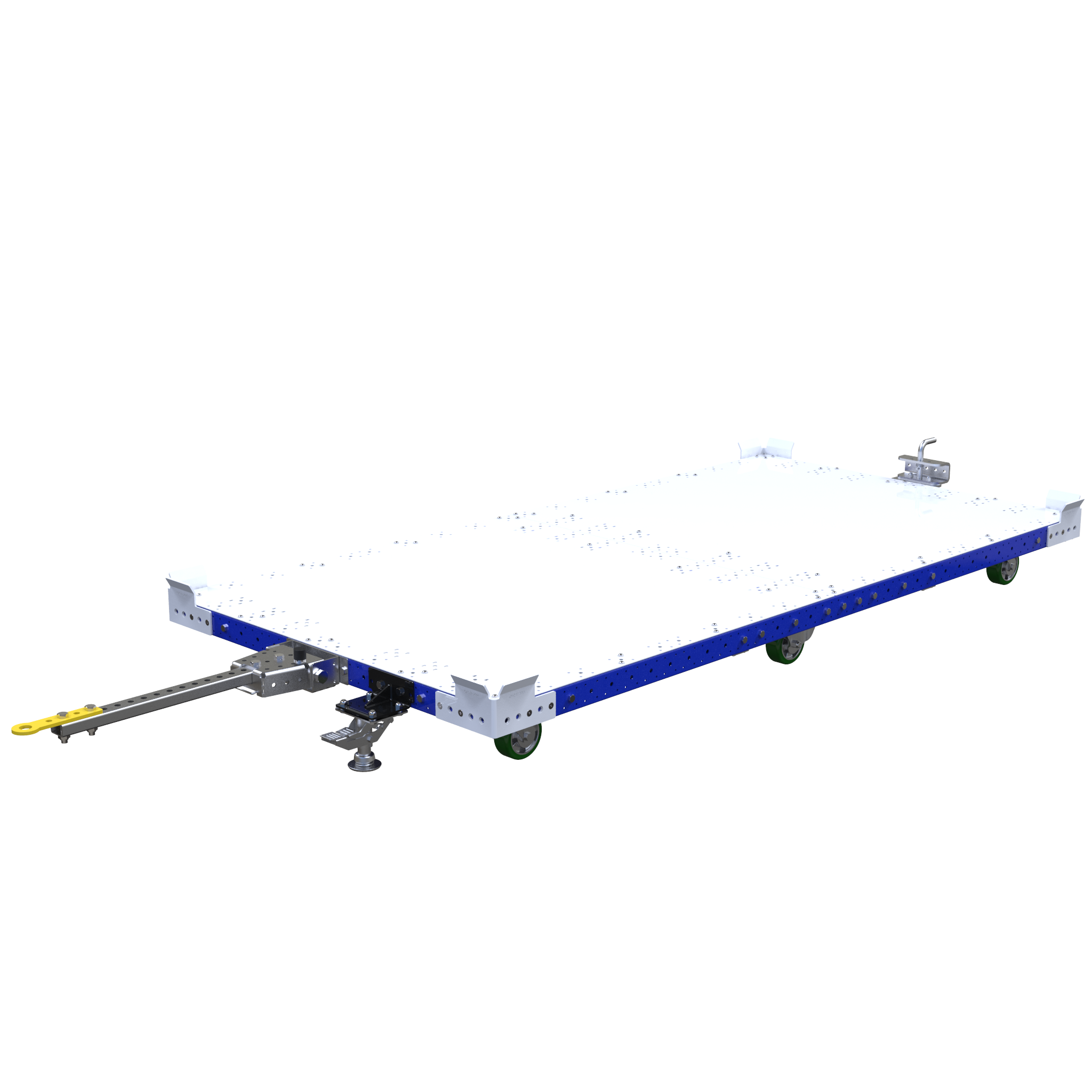 Deze industriële heavy-duty plateauwagen is ideaal voor het transporteren van lange houten of plastic paletten doorheen uw magazijn en productieomgeving. Door het ontwerp met een volledig plateau is de kar geschikt voor elke palletmaat tot 2500x1200mm. Deze kar is ontworpen met een trekhaak waardoor meerdere van deze karren tegelijk kunnen verplaatst worden in een treinvorm. Verder is er ook een vloerrem en 6 PU wielen (2 vast en 4 zwenkwielen) die zorgen dat de karren mooi en zo goed als geluidsloos het spoor volgen als ze in treinvorm worden getrokken.
