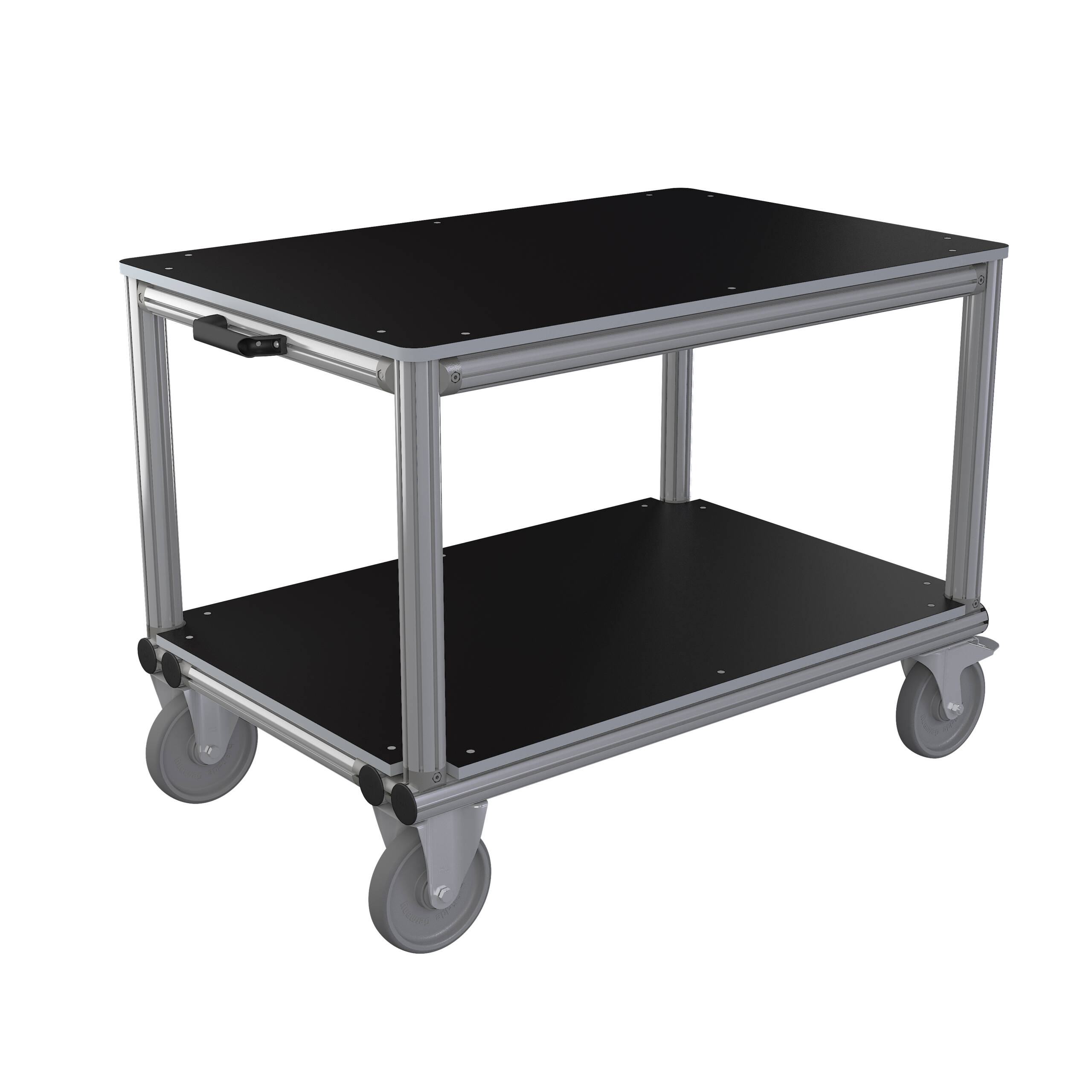 Deze industriële plateauwagen kan als transportkar en als mobiele assemblage plek gebruikt worden en is ontwikkeld om bukken te vermijden waardoor de opertoren ergonomischer kunnen werken. Het onderste laadvlak heeft een hoogte van 312mm en de bovenste plateau zit op 915mm hoogte. De plateau's zijn gemaakt van panelen met een zeefdrukcoating. Dit zorgt voor een slijtvast en antislip oppervlak. Verder is er ook een handvat en hoogwaardige kogelgelagerde wielen van polyurethaan, ø 200 mm, grijs, streeploos. Twee vaste wielen en 2 zwenkwielen met rem. Draagvermogen: 500 kg, Geleverd in onderdelen - eenvoudig te monteren. Dankzij het modulaire concept zijn ook andere configuraties en afmetingen mogelijk. Vraag ernaar ! Technische specificaties: - Categorie: plateaukar - Industrie: Automotive, wapenindustrie, Defense Equipment, Distribution, Industrial Machinery, Tier One Suppliers, Wind & Energy - Transportmethode: manueel - Afmetingen: 1200 x 800 x 915 mm - Draagvermogen: 500kg - Wieldiameter: 200mm - Wiel type: Polyurethaan