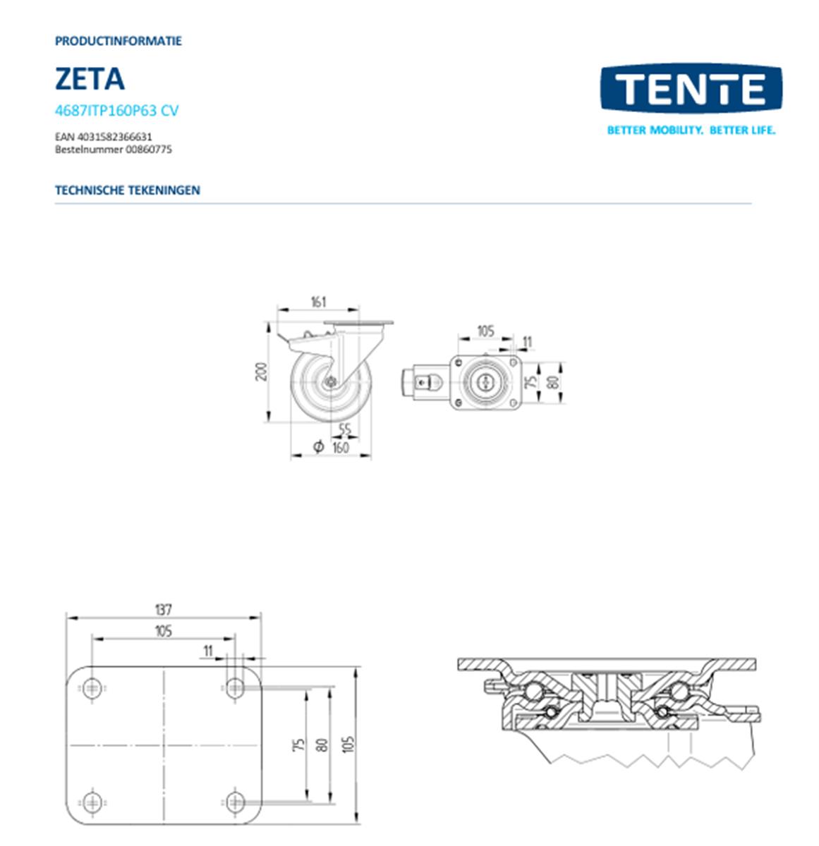 Zwaarlast zwenkwiel met dubbele rem – TENTE 4687ITP160P63 – polyurethaan convex – dia 160mm – max 800 kg – 00860775