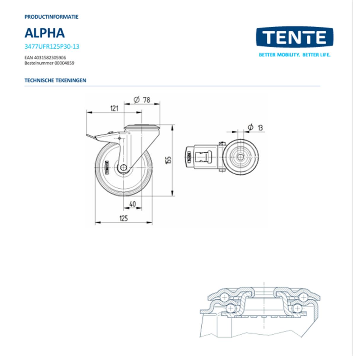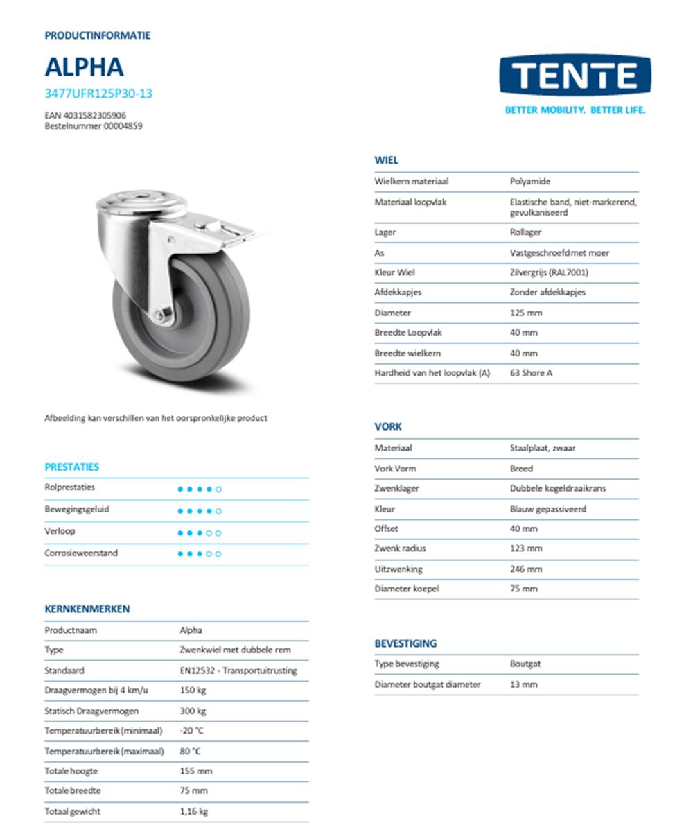 Zwenkwiel met dubbele rem – TENTE 3477UFR125P30-13 – grijs rubber – dia 125mm – max 150 kg – 00061114