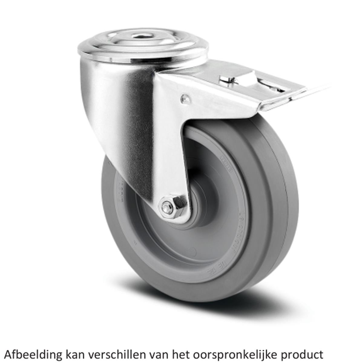 Zwenkwiel met dubbele rem, vork van geperst staal, verzinkt, dubbele kogeldraaikrans in de zwenkkop, wielas geschroefd, stofafdichting, bevestiging met boutgat.